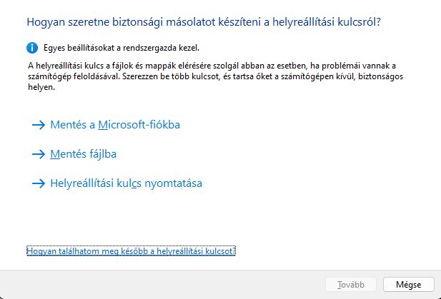 A helyreállítási kulcs biztonsági másolatának létrehozására, vagyis a recovery key lementésére három opció közül választhatunk: