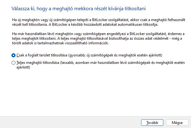 • Csak a foglalt terület titkosítása: Kevés adattal rendelkező és/vagy új meghajtó esetén célszerű ezt választani.