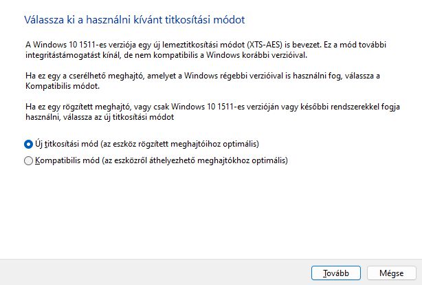 Nyomjunk egy tovább-ot és válasszuk ki, hogy Új titikosítási módot (rögzített meghajtó esetén javasolt) vagy a Kompatibilis titkosítási módot (cserélhető meghajtó esetén javasolt) akarunk-e használni. Utána nyomjunk egy tovább-ot.