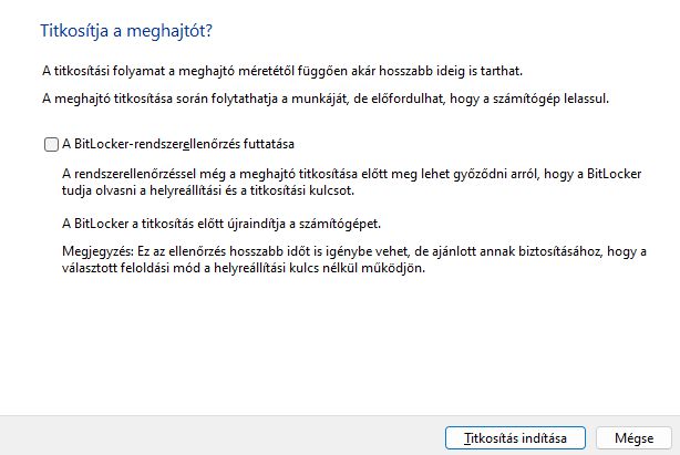 A titkosítás előtt a szolgáltatás felajánl nekünk egy rendszerellenőrzést, melynek segítségével meggyőződhetünk róla, hogy a szoftver felismeri a létrehozott helyreállítási kulcsot. Ha futtatni szeretnénk, csak pipáljuk be a boxot mielőtt a titkosítás indítása gombra kattintanánk.