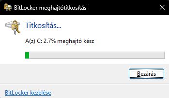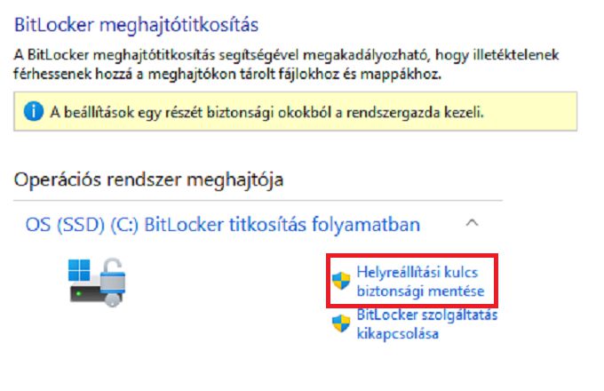 A titkosítás folyamata alatt még van lehetőségünk a biztonsági kulcsot (újra) lementeni, ehhez a BitLocker kezelése menüpont alatt található, Helyreállítási kulcs biztonsági mentése gombra kell kattintani.