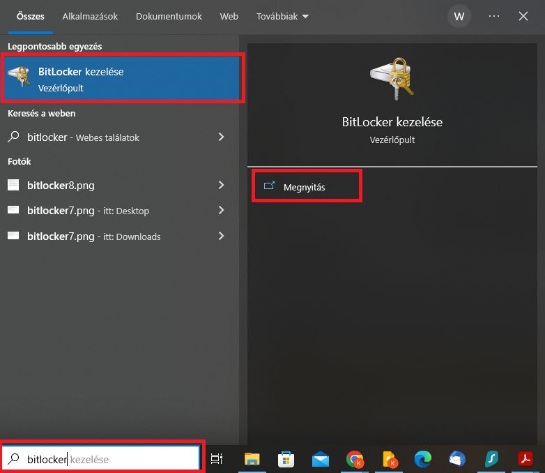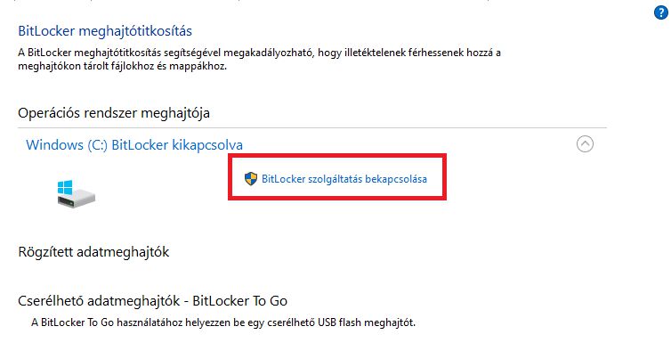 V: Keressünk rá a BitLocker kezelése opcióra a Tálca bal alsó sarkán található keresőmezőben, majd kattintsunk az Operációs rendszer meghajtója menüpont alatti, szolgáltatás bekapcsolása pontra.