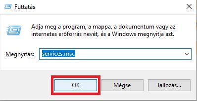 2. A megnyitás mezőbe írjuk be a services.msc (ez nyitja majd meg a Szolgáltatások fület) parancsot és üssünk egy Entert vagy nyomjunk “OK”-ot.