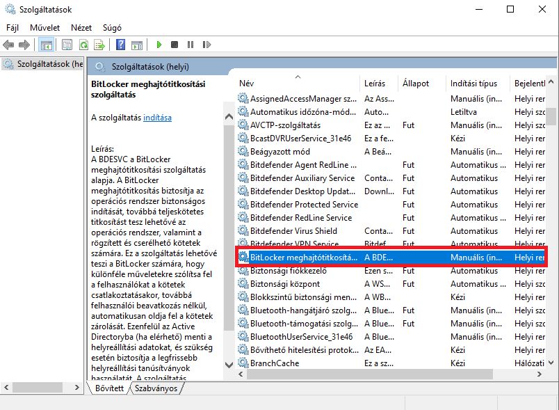 1. A Szolgáltatásoknál keressük ki a BitLocker meghajtótitkosítási szolgáltatást, majd kattintsunk rá kétszer.
