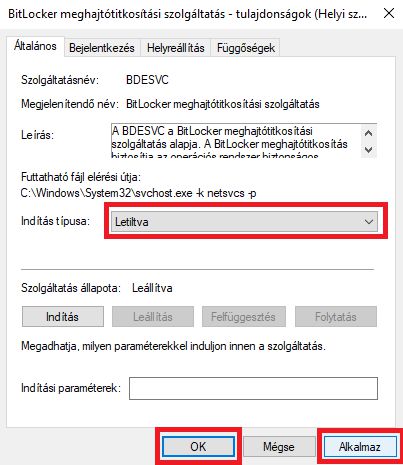 1. A felugró ablakban az Indítás típusa pontnál tiltsuk le a szolgáltatást. Ezt követően nyomjunk az “Alkalmaz” gombra, majd kattintsunk az “OK”-ra. Készen is vagyunk.