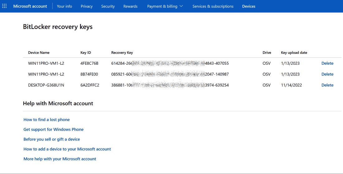 • -Microsoft-fiókban: A legegyszerűbb és legkézenfekvőbb megoldás természetesen, ha aktiváláskor a Microsoft-fiókba történő mentést választottuk, ilyen esetben ugyanis nem kell más tenni, mint a fiókba egy másik eszközről (telefon, tablet, másik laptop vagy PC) bejelentkezni és a https://account.microsoft.com/devices/recoverykey linken kikeresni az adott eszközhöz rendelt kulcsot.