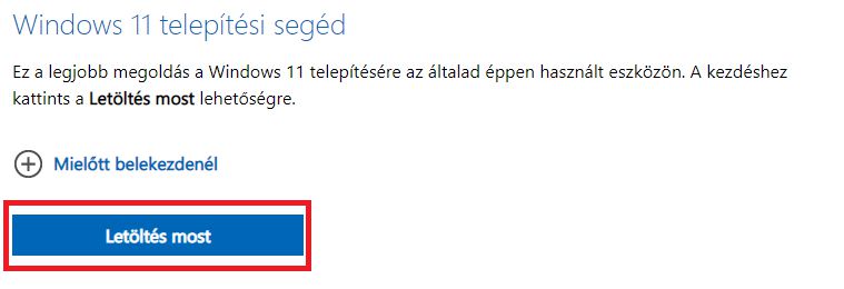 - Mivel az upgradehez nekünk a Windows 11 telepítési segédre lesz szükségünk, így válasszuk azt és kezdjük meg a telepítő letöltését.