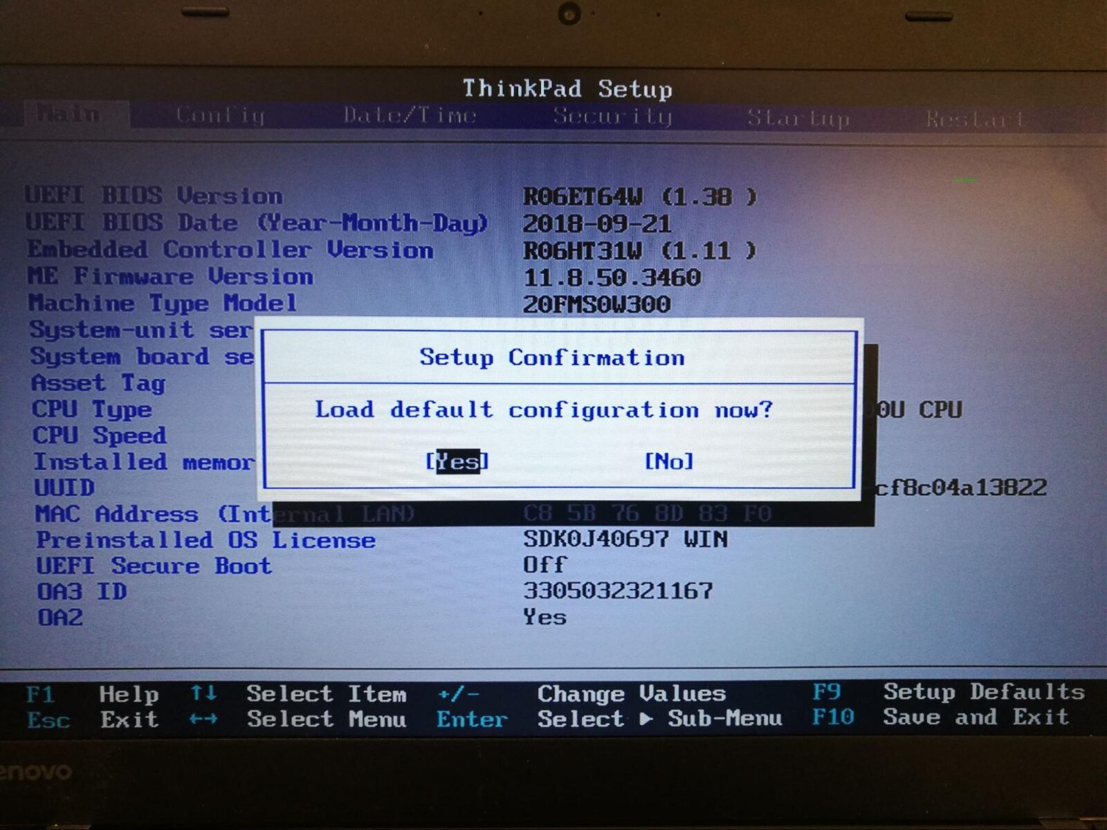- Miután a gyári visszaállításáért felelős menüpontot megtaláltuk, válasszuk ki. Ezt Thinkpadek esetén a lent, a láblécében, általában F9-cel jelölve (Setup Defaults), HP-k esetén a File fül alatt, Restore Defaults néven, míg a Dell-nél szintén alul, Restore Settings címen találjuk. Nagy valószínűséggel a rendszer megkérdezi majd, hogy biztosan vissza akarjuk-e állítani az alap beállításokat, így itt kattintsunk a yes-re vagy nyomjunk egy Y-billentyűt.