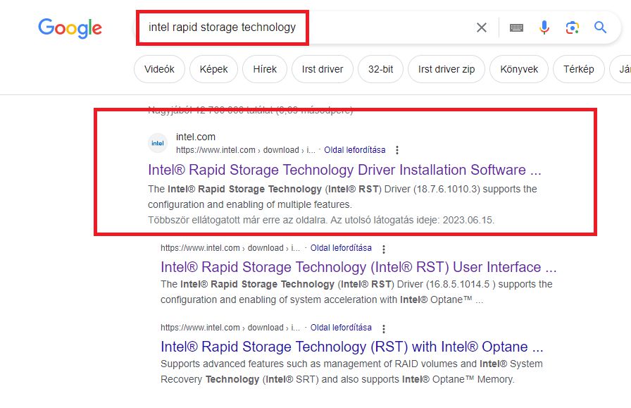 - Menjünk fel az Intel oldalára manuálisan és keressük meg az Intel Rapid Storage drivert. Ez persze Google-ön keresztül is működik, ilyen esetben az adott kulcsszavak (pl.: IRST driver download, intel rapid storage technology, stb.) segítségével jussunk el a gyártó oldalára és szedjük le az IRST illesztőprogramot. Persze, ha meg akarjuk spórolni a keresgélést, úgy az alábbi linkre kattintva rögtön az IRST oldalán találjuk magunkat.