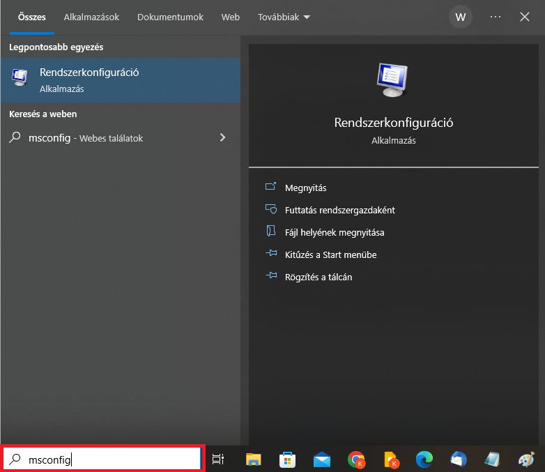 Hogyan kell csökkentett módba lépni? Csökkentett módba a legegyszerűbben a bal alsó sarokban található keresősáv segítségével tudunk belépni. Kattintsunk be és írjuk be, hogy msconfig.