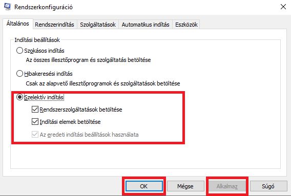 Ennek segítségével juthatunk el a Rendszerkonfiguráció ablakba, ahol az általános fül alatt található, Szelektív indítás rubrika fog nekünk kelleni. Pipáljuk be, nyomjunk rá az alkalmaz gombra, okézzuk le és a következő rendszerindításnál már a csökkentett mód fogad majd minket.