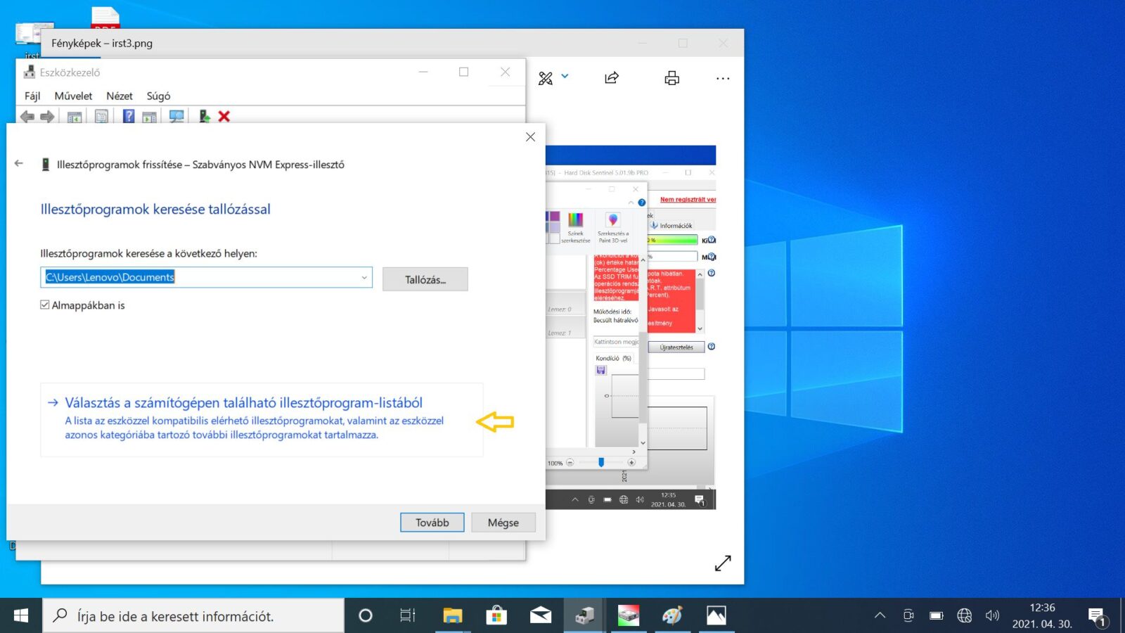Fontos, hogy ezt követően ne az “Illesztőprogramok automatikus keresése” pontot, hanem az “Illesztőprogramok keresése a számítógépen” pontot, majd pedig a “Választás a számítógépen található illesztőprogram-listából” opciót válasszuk.