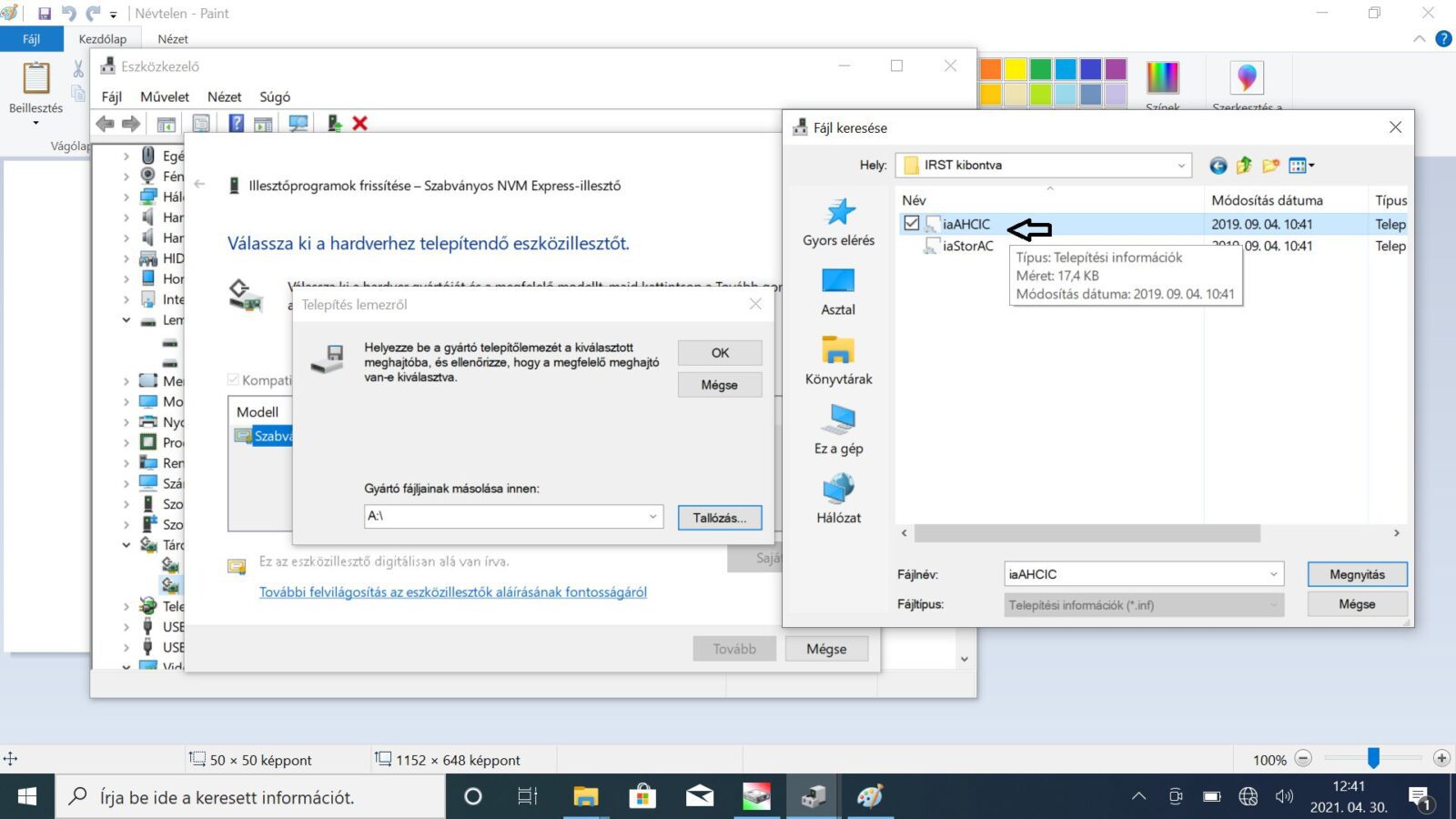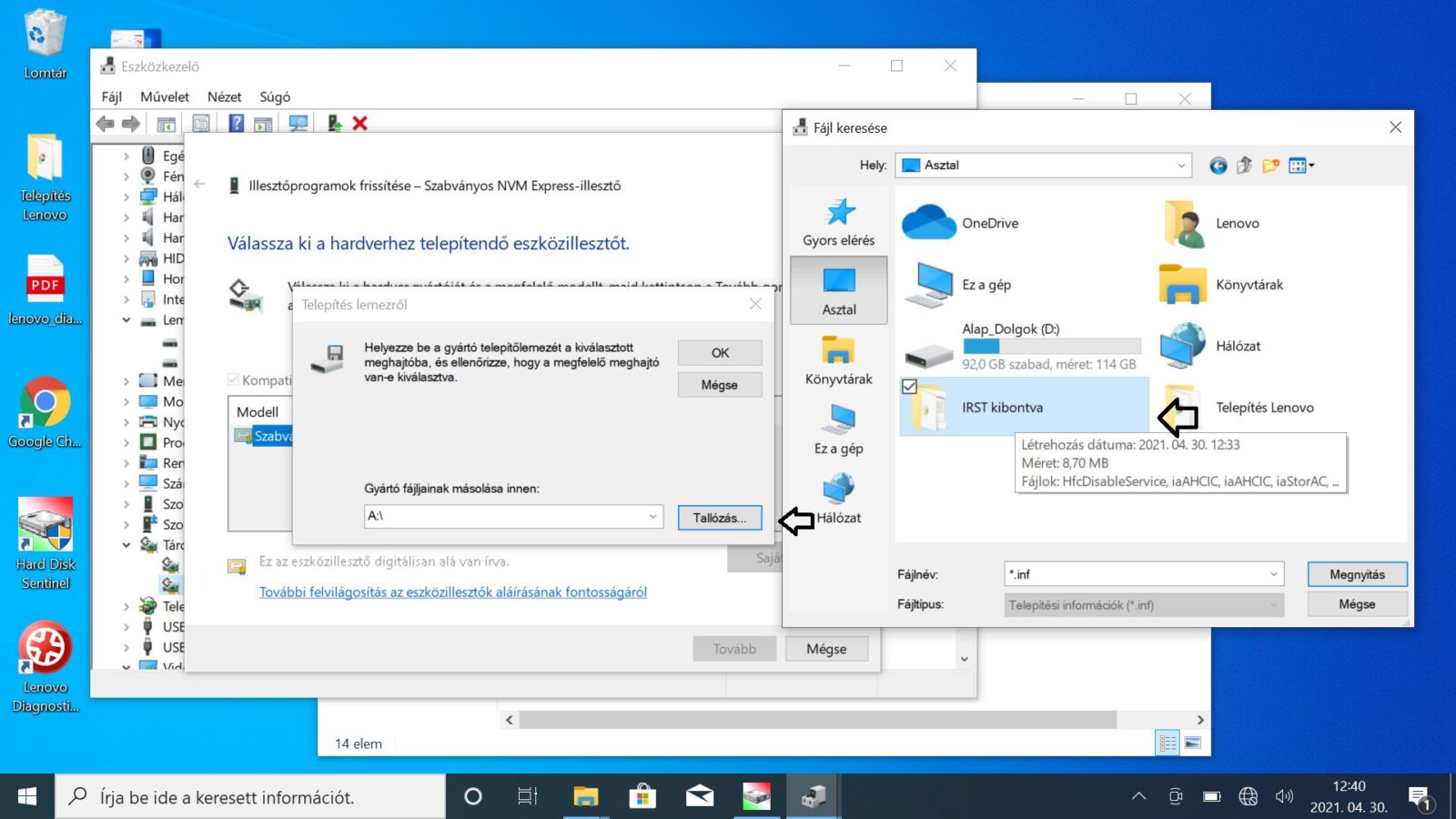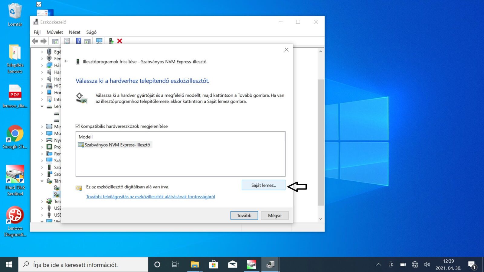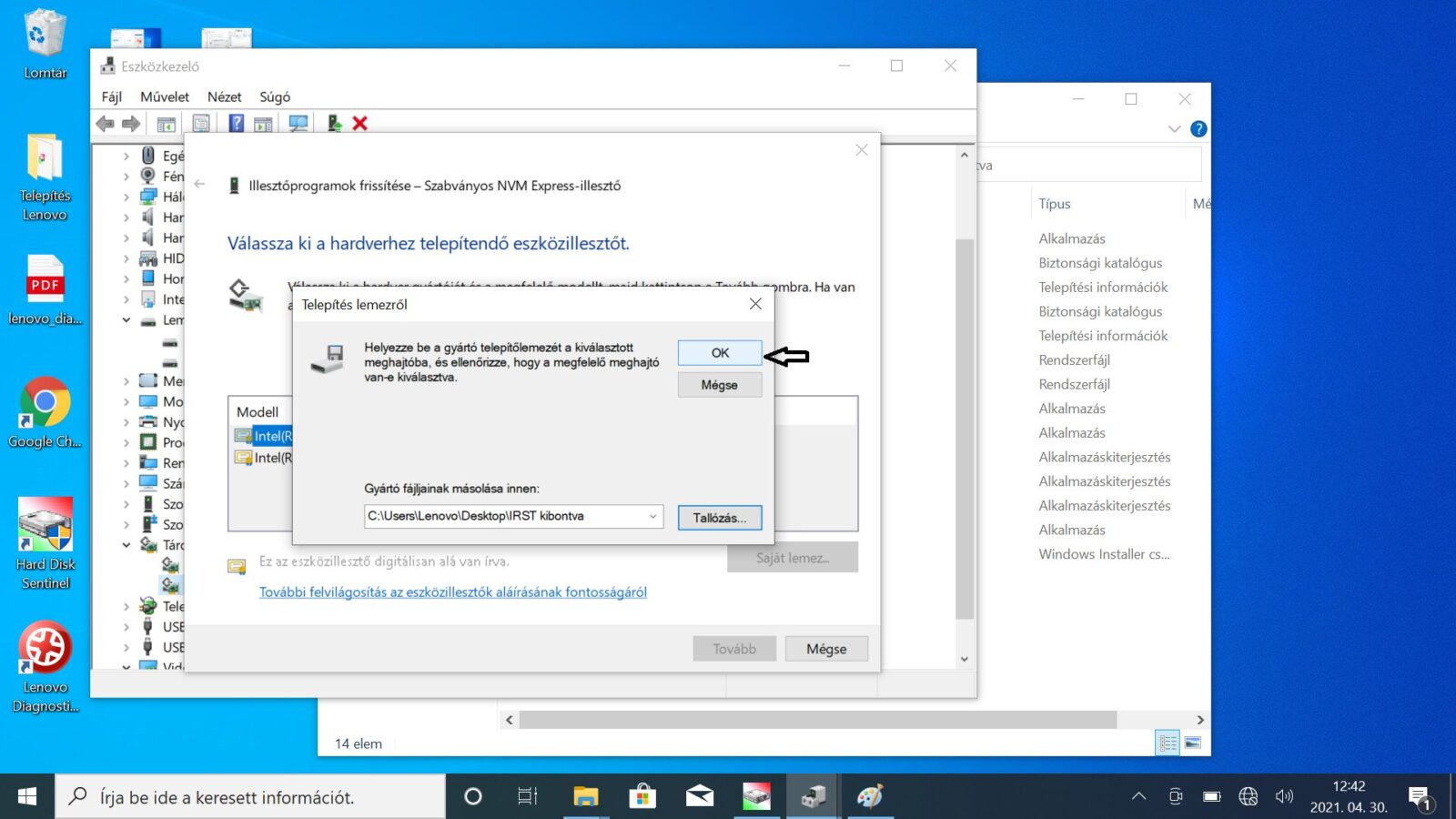 Ezt követően a telepítendő eszközillesztőt kell majd kiválasztani. Kattintsunk a saját lemez gombra és tallózzuk be az IRST drivert. A teljes tallózási folyamatról mutatjuk a screenshotokat lépésről-lépésre.