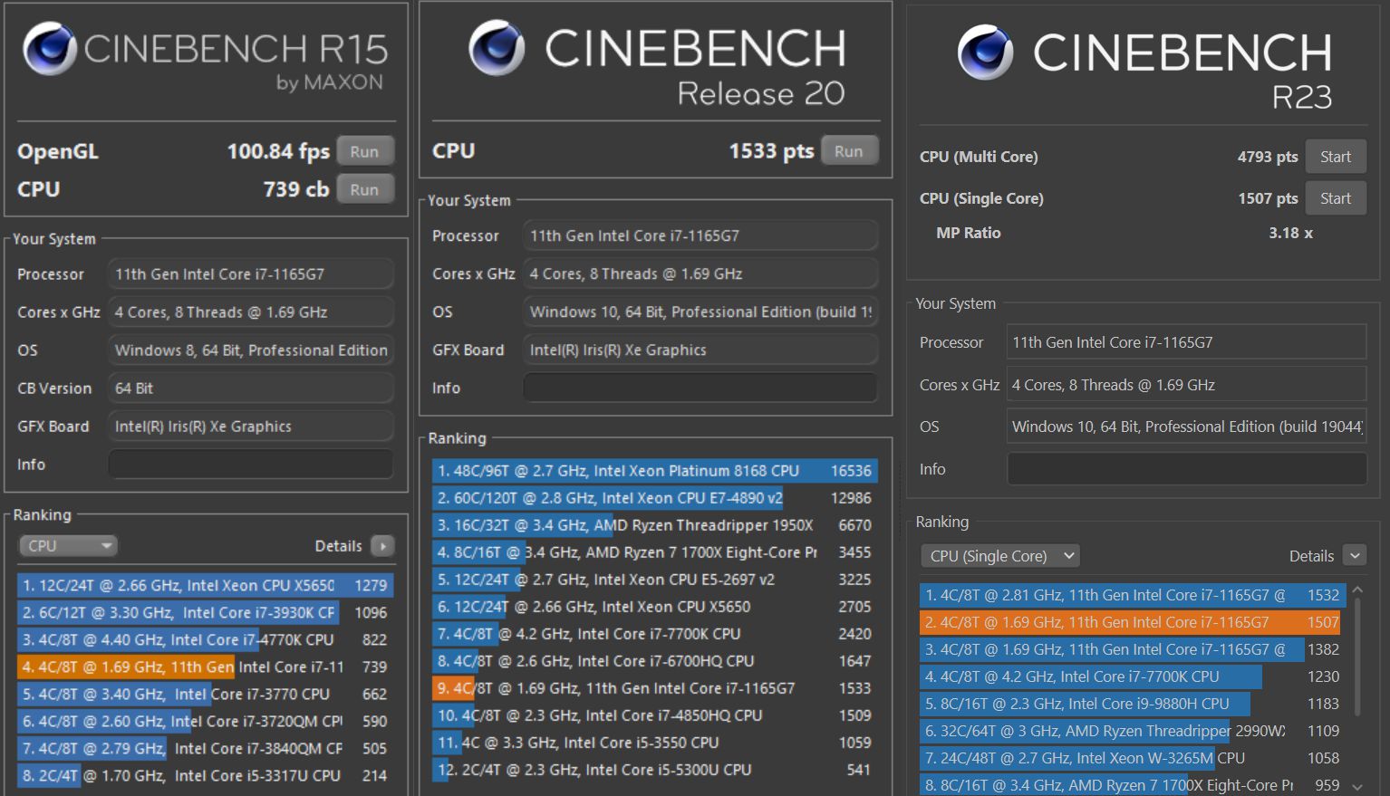 Az i7-1165G7 teljesítménye a Cinebench eredményei alapján