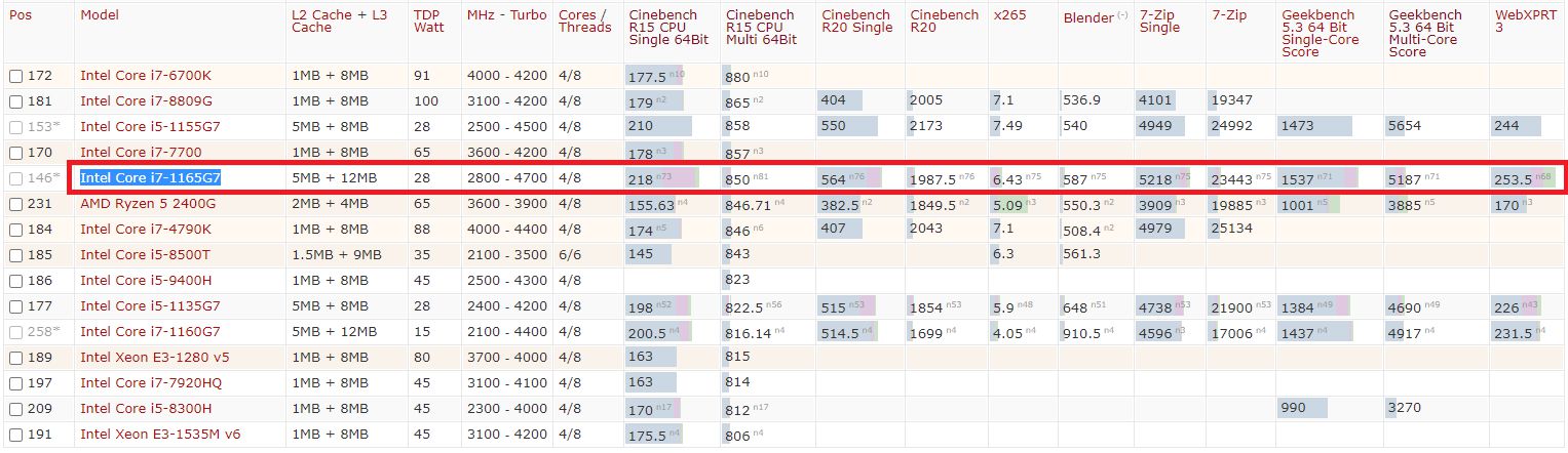 Az alábbi notebookcheck-es listából jól látható, hogy a benchmark összeredményeket figyelembe véve, az i7-1165G7 olyan megoldásokat kényszerített maga mögé, mint az asztali fronton elérhető i7-4790K és i5-8500T, az i5-9400H vagy az i7-7920HQ.