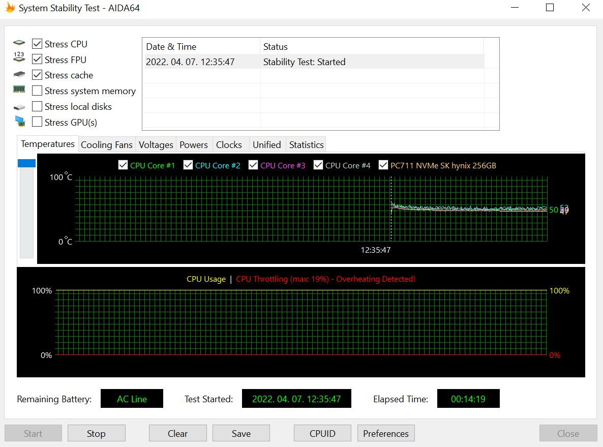 Az AIDA64 Extreme alatt a CPU-t, az FPU-t és a cache-t terheltük egyidőben. A terhelési folyamat alatt a processzor magjainak átlaghőmérséklete ~ 50-55 fok volt, mely a stresszteszt kezdetén fel-felugrott 70+ fölé, majd egy rövid, ~ 60-65 fokos etapot követően végül beállt ~ 49-53 fok közé.