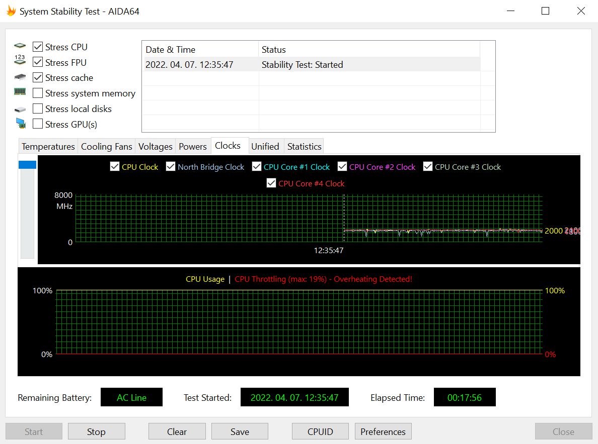 A stressz teszt előtt, nyugalmi állapotban a processzor órajele 1300 Mhz volt, majd a tesztet indítva 4100 Mhz-re ugrott, hogy pár pillanattal később aztán szépen lassan csökkenni kezdjen, néhány percig tartva egy 3000-3400 Mhz közötti értéket. Néhány percet követően végül ez az érték 2000-2100 Mhz-re esett, majd ez az átlag a teszt közel egésze alatt tartotta is magát.