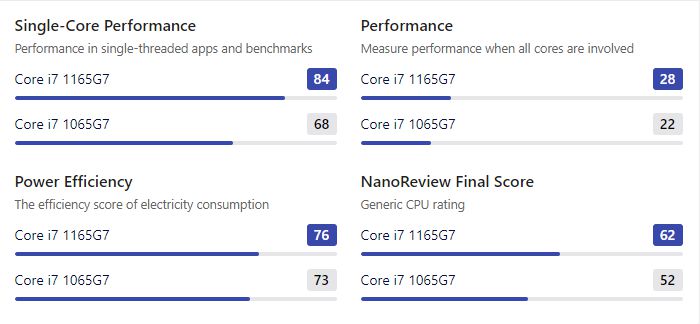 A két CPU közötti generációs különbségeket természetesen a nanoreview tesztjei is alátámasztották, ráadásul nem csupán az egy- és többmagos feladatok közötti nyers százalékos fölények kerültek megerősítésre, hanem a lefuttatott benchmarkok is 13% – 35%-os különbséget mértek a 11. genes processzor javára.