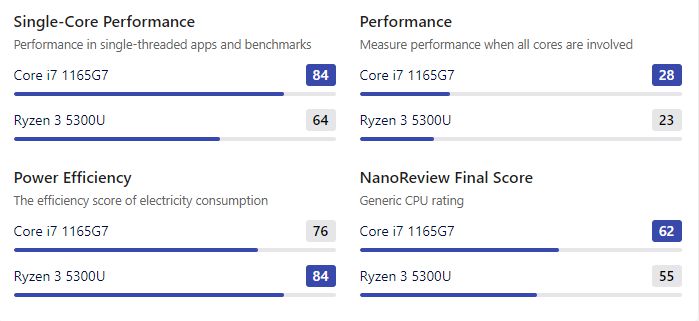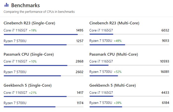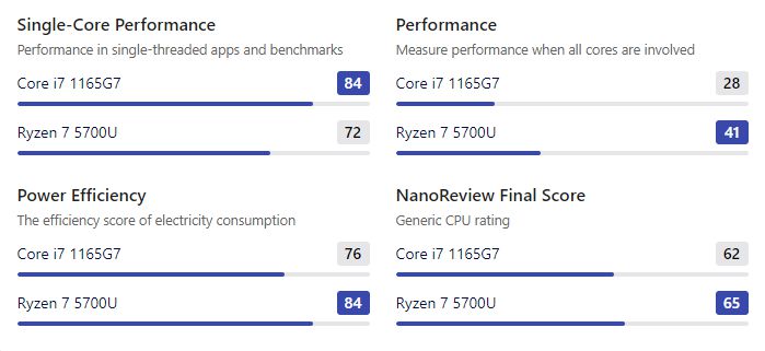 A nanoreview tesztjei alapján a UserBenchmark-os eredmények megerősítésre kerültek, vagyis az i7-1165G7 az egy- és kétmagos 10% – 21%-os előny), az 5700U pedig a többmagos (39% – 52%-os előny) feladatokban jeleskedett.